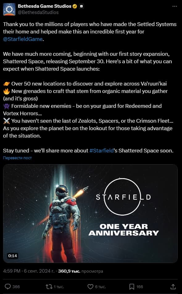 Bethesda намерена дорабатывать проект, о чём свидетельствует масштабное дополнение, которым попробуют возродить интерес к космическому приключению. Выход DLC должен состояться 30 сентября 2024 года и обещаний действительно много - от связанных с геймплейной механикой до чисто художественных.