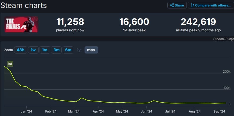 Как видно из приведенного выше изображения SteamDB, The Finals уже потеряла 95% игроков со дня запуска, и, несмотря на два даже неплохих месяца, всё еще катится вниз, не в силах справиться с растущей конкуренцией и давлением индустрии. А ведь прошло всего чуть больше девяти месяцев.