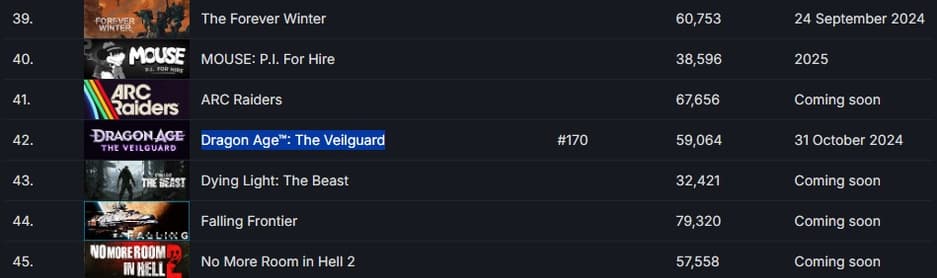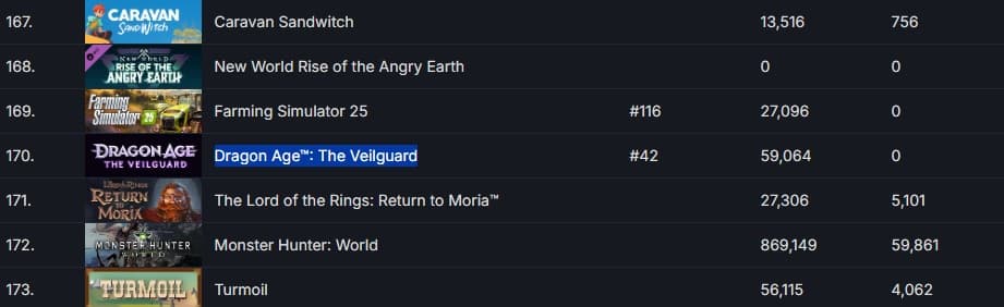 Dragon Age: The Veilguard до сих пор не смогла войти в сотню бестселлеров в Steam, а на момент публикации заметки заняла 170 место.