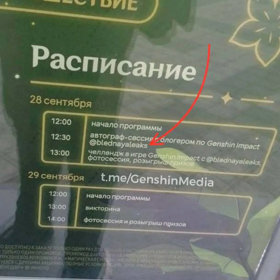 В сообществе «Genshin Media» опубликовали расписание события в честь годовщины Genshin Impact. Можно заметить в списке пункт про автограф-сессию и «челендж в игре Genshin Impact с [Бледной], фотосессия, розыгрыш призов». При этом «Бледную» здесь называют просто «блогером по Genshin Impact».