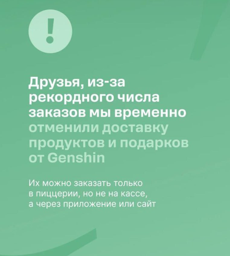 Вскоре организаторы были вынуждены ввести некоторые ограничения: «Друзья, из-за рекордного количества заказов мы временно выдаем комбо Вкусное путешествие и пиццу Сокровище леса только в пиццерии при заказе через приложение или сайт. Вся наша команда очень старается, чтобы новинки из коллаборации с Genshin Impact вернулись в доставку как можно скорее».