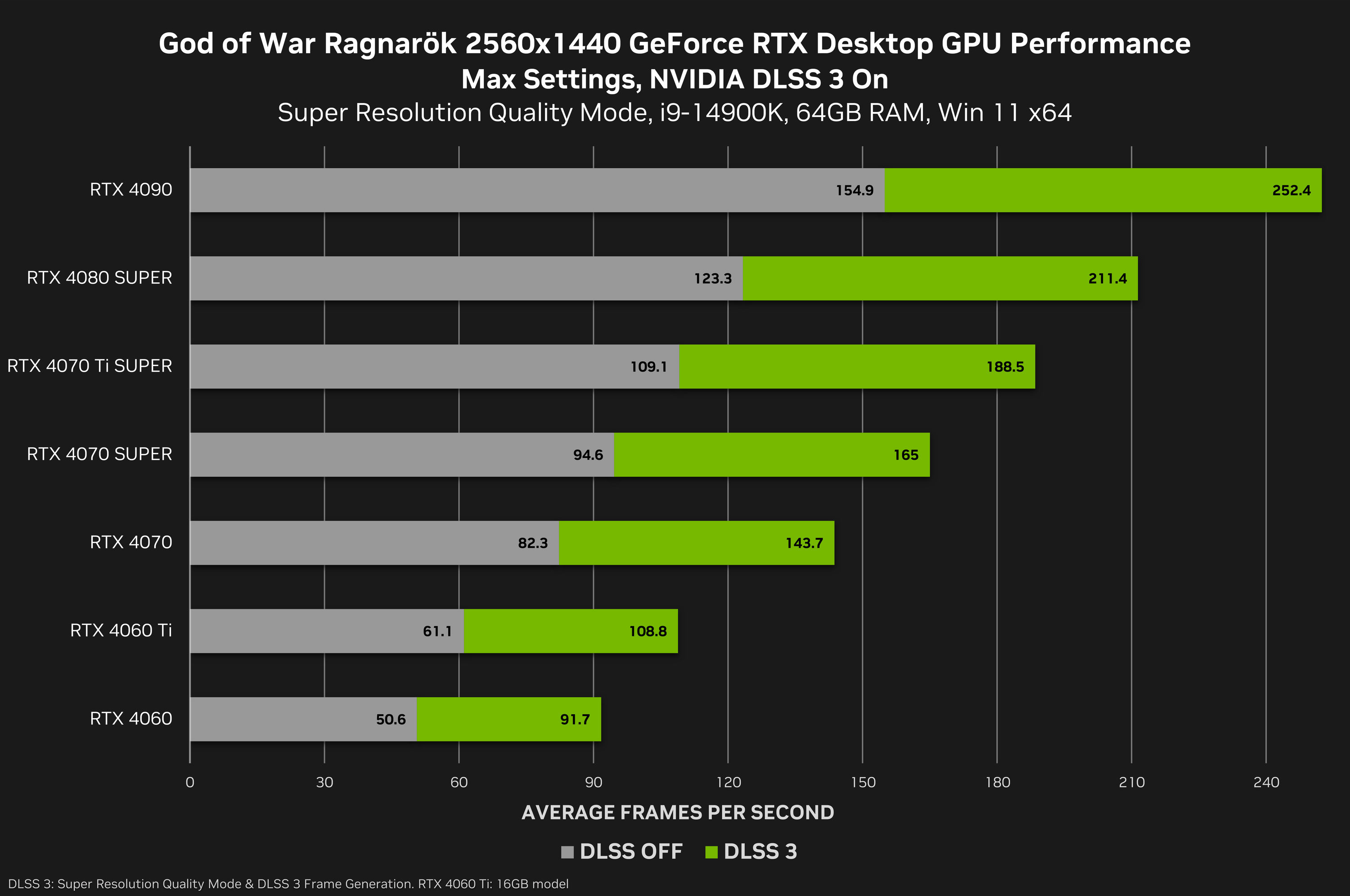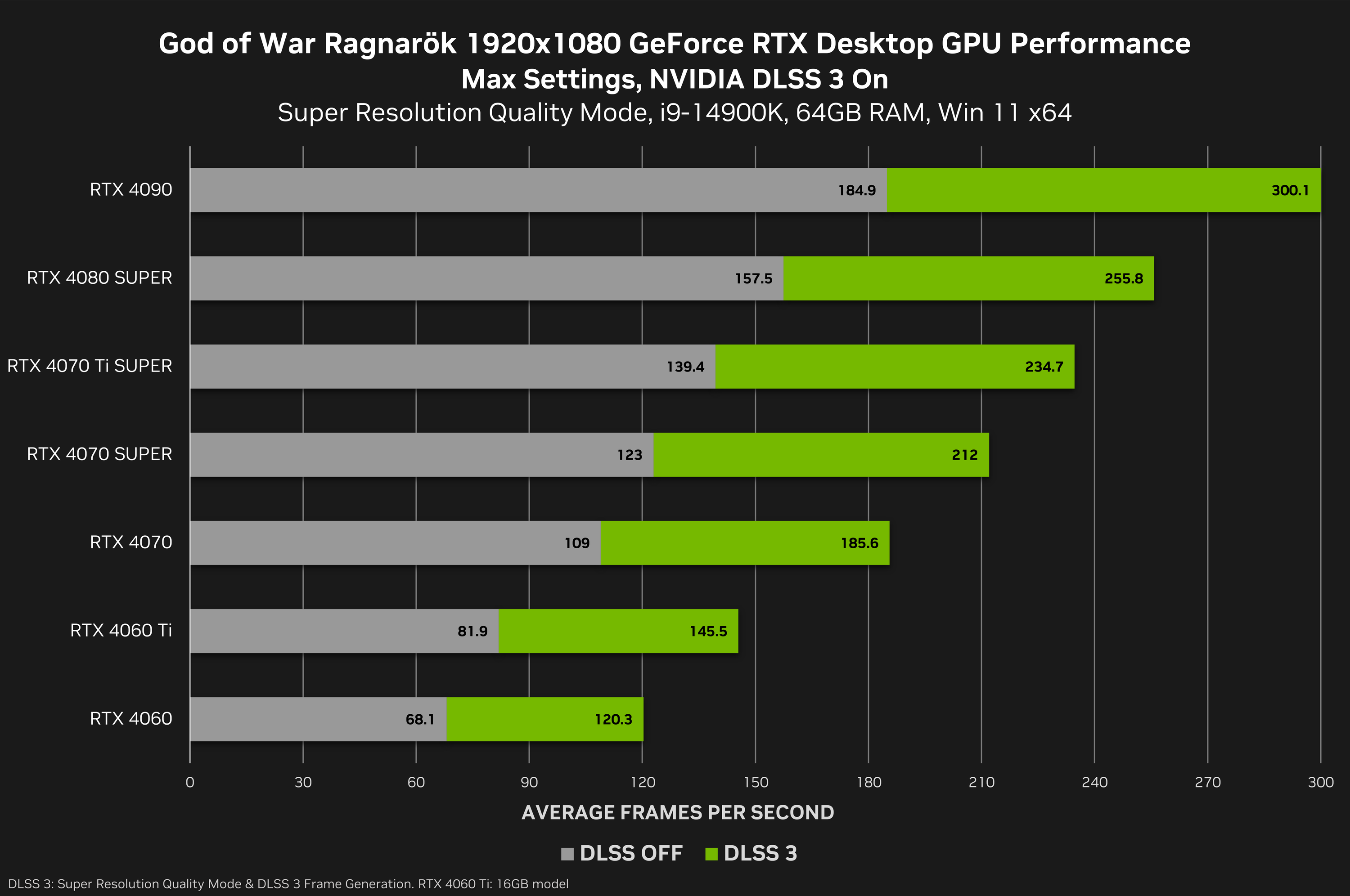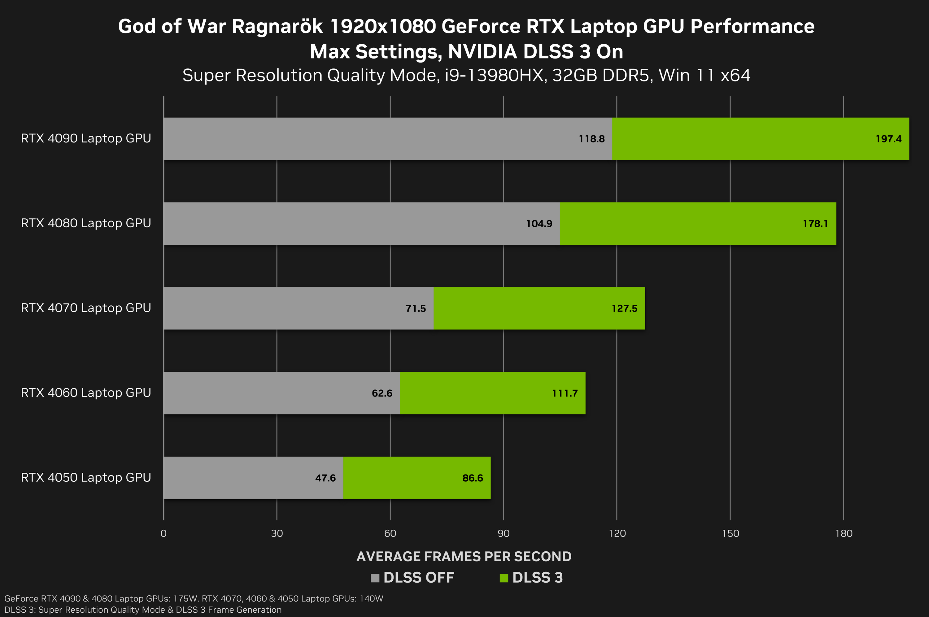 В случае с God of War Ragnarok в разрешении 1920 x 1080p при максимальных настройках в сочетании с технологией DLSS 3 владельцы GeForce RTX 4090 могут рассчитывать на более чем 300 FPS, или же чуть больше 184 FPS без данной технологии. На версии RTX 4090 для ноутбука показатели поскромнее — 118 и 197 без и с технологией DLSS 3 соответственно.