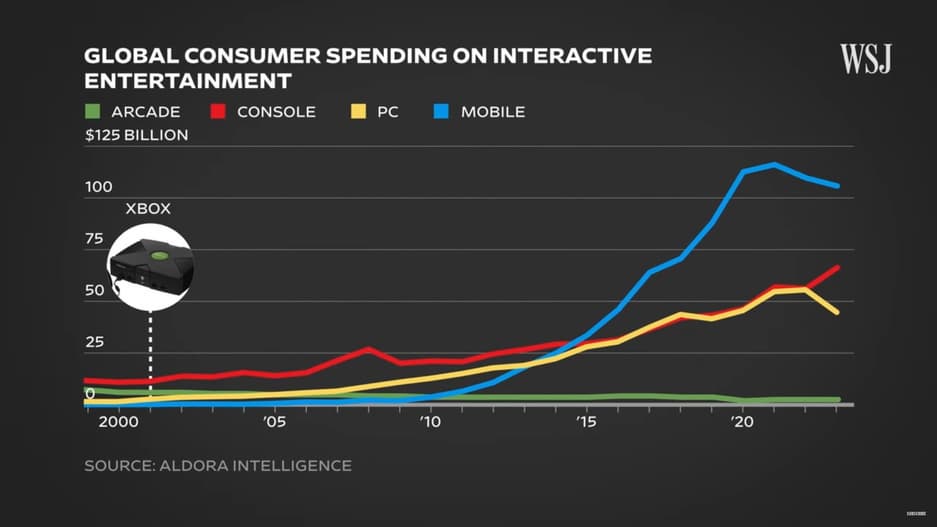 Недавно Wall Street Journal опубликовал видеоролик, в котором обсуждаются причины проигрыша Xbox в консольных войнах. В видео показали график, который демонстрирует потребительские расходы на ПК и консоли в разные годы.