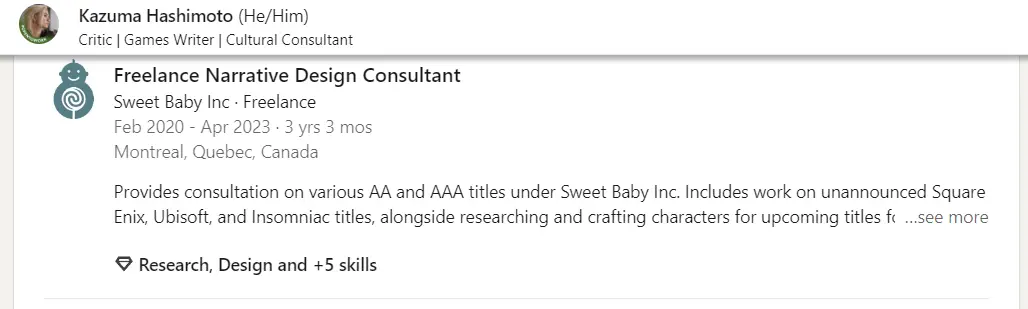 Как оказалось, Хашимото является бывшим сотрудником Sweet Baby. Он работал в конторе по продвижению повестки в период с февраля 2020 по апрель 2023 года, выступая консультантом для Insomniac Games, Square Enix и той же Ubisoft.