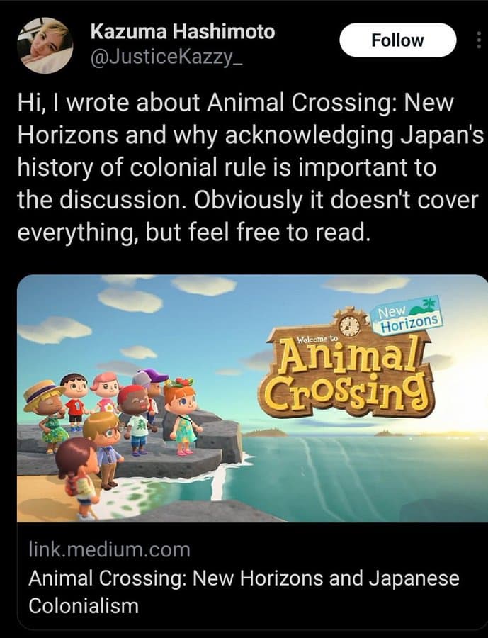 Сейчас Хашимото пишет статьи для Polygon, Siliconera и других изданий. Для Medium журналист написал материал об Animal Crossing: New Horizons, в котором он попытался затронуть тему японского колониализма.