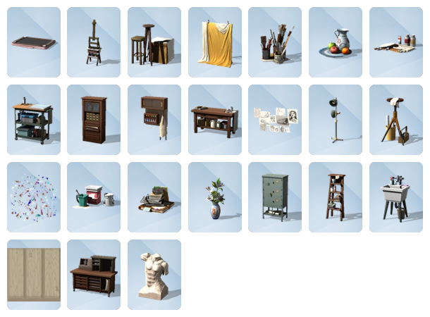 «Инструменты для искусства. Подарите симам больше возможностей для самовыражения. Новый мольберт, планшет и столярный станок пригодятся им в их творческих начинаниях. Расставьте вокруг реквизиты для натюрмортов, фон и прочие предметы бутафории, чтобы прилив вдохновения бил ключом.