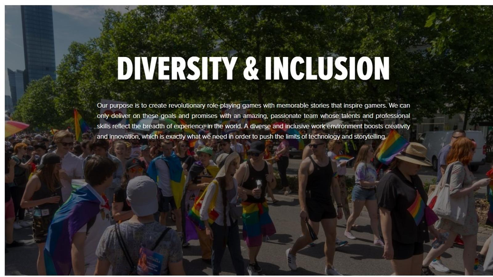 На официальном сайте CDPR есть раздел, посвященный разнообразию и инклюзивности. Цель программы - создание разнообразных команд, инклюзивных лидеров и справедливых процессов. Но наставничество и степендии предоставляются только женщинам и приводятся слова директора по культуре, разнообразию и инклюзивности Агнешки Шамалек-Михальской: