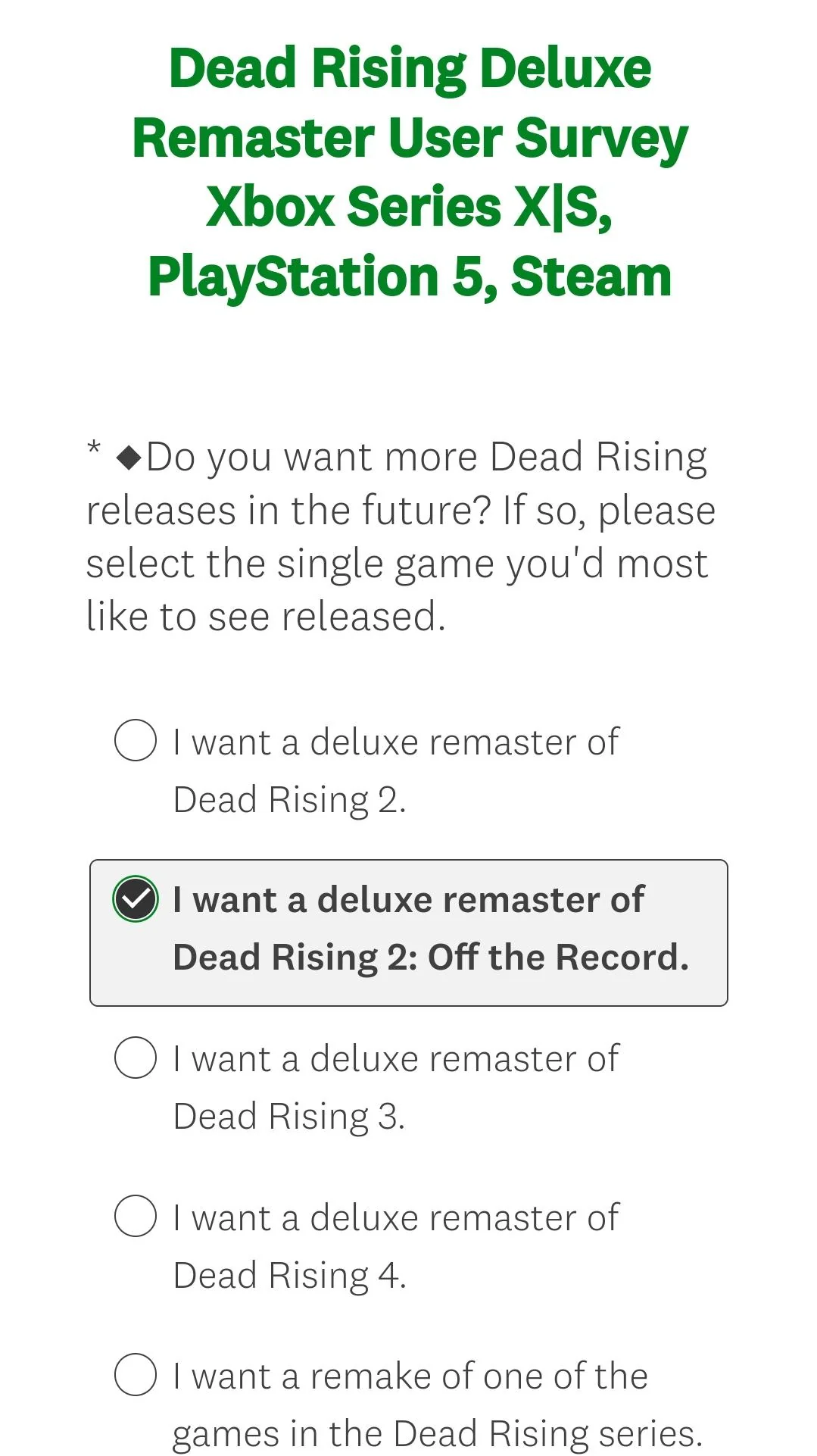 Издатель интересуется: что они ожидают от франшизы в будущем, хотелось бы им получить новые проекты. Среди вариантов ответов есть ремастеры Dead Rising 2,3 и 4, а также вариант с ремейком.