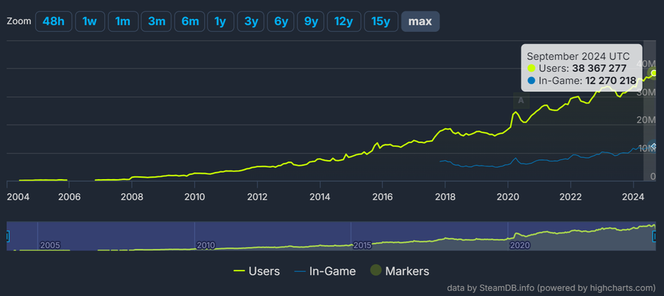 В сентябре на выходных сервис SteamDB зарегистрировал новый рекорд — количество одновременных пользователей Steam впервые за более чем 20-летнюю историю сервиса преодолело планку в 38 миллионов и достигло отметки в 38 367 277 игроков.