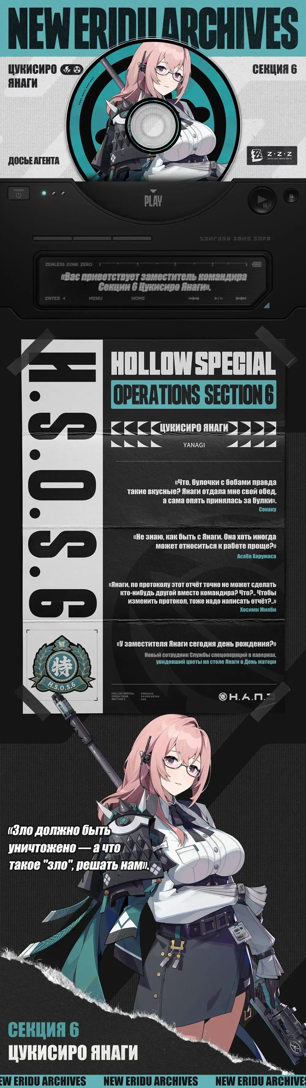 В центре внимания оказалась Цукисиро Янаги из фракции «Секция 6», её атрибут Электро и специальность Аномалия. Ранг данного персонажа пока не раскрывается (предположительно, речь идёт о S-ранге).