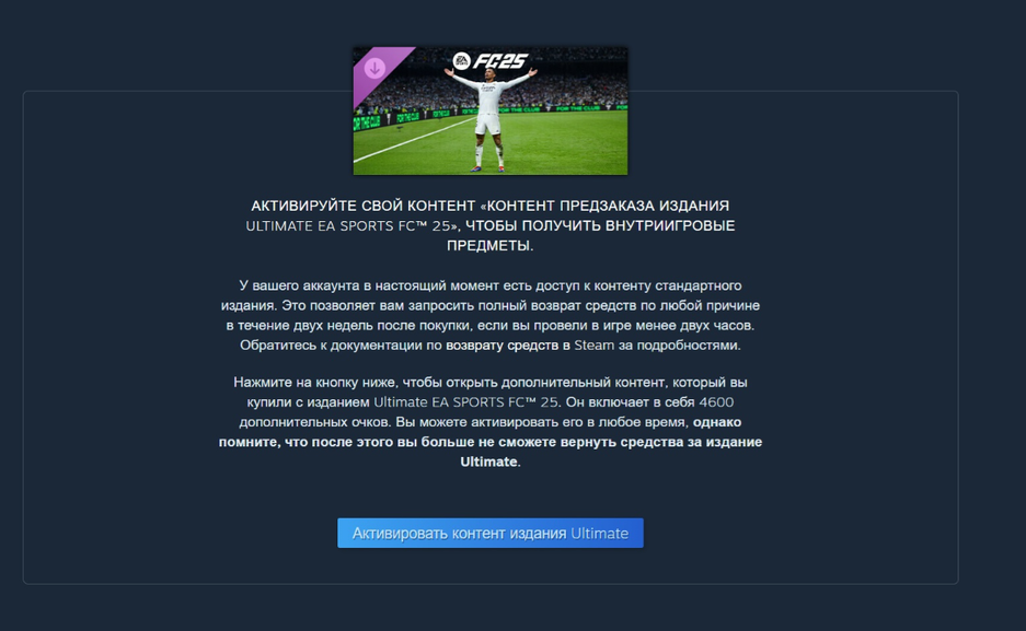 Пользователи нашли не совсем очевидное решение данной проблемы. В ряде случаев достаточно просто проследовать в библиотеку Steam и на странице EA Sports FC 25 нажать кнопку «Получить контент издания Ultimate» и затем подтвердить активацию. После этого на аккаунт в Steam будут начислены соответствующие бонусы, а при запуске русский язык и другие должны появиться в настройках. Не совсем понятно, чем вызвана такая специфическая блокировка. Есть нюанс — после активации деньги за издание Ultimate уже не вернуть.