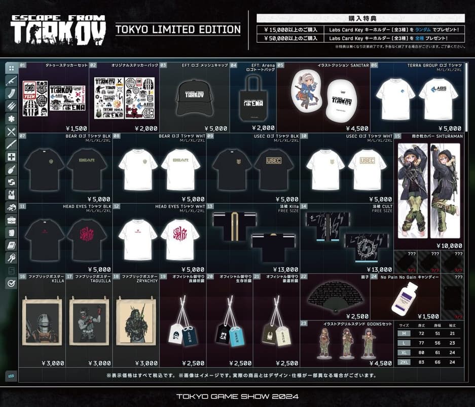 В ассортименте также представлены футболки, кепки, статуэтки, наклейки, большие сумки и копии внутриигровых предметов, таких как ключи-карты. Посетители выставки также смогут приобрести более специфичные для Японии товары вроде складных вееров и пакетиков чая. Вся линейка товаров называется Tokyo Limited Edition.