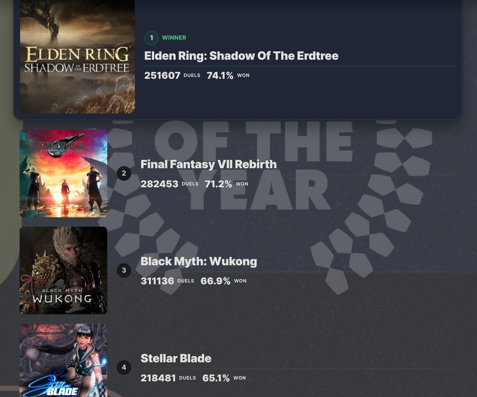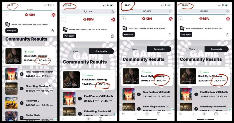 «...Рейтинги по уже завершившемуся опросу "Лучшая игра 2024 года" на ходу правятся так, что китайская игра, лидировавшая с 90.4%, начинает иметь 74.4% одобрения. Теперь ближайший конкурент - идеологически правильная Final Fantasy 7 Rebirth - уже всего в трёх процентах..».