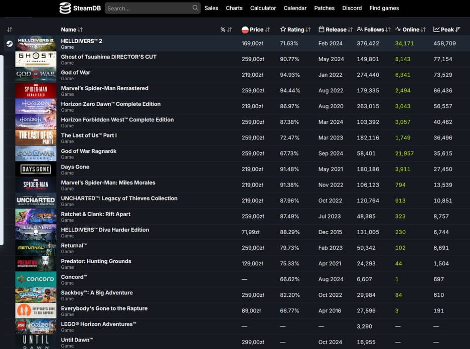 Со стороны Sony Interactive Entertainment было правильным решением выпустить Ghost of Tsushima на ПК в версии Director's Cut несколько месяцев назад. Об этом свидетельствуют результаты онлайна в Steam: игра занимает второе место по количеству игравших на пике - в ней находилось 77 154 игрока. Её обогнала только сетевая Helldivers 2, но если рассматривать одиночные игры, то здесь лидирует проект Sucker Punch Productions.