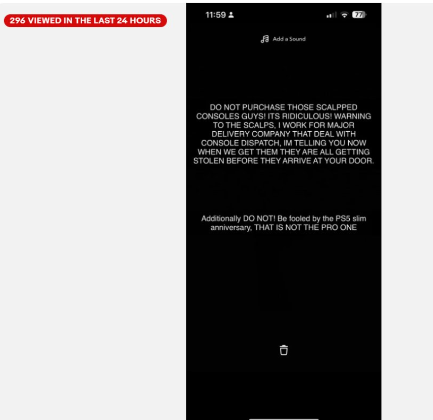 «Предупреждение скальперам [спекулянтам], я работаю в крупной компании по доставке, которая занимается отправкой консолей. Я вам говорю: когда мы их получим, их все украдут, прежде чем они прибудут к вам».