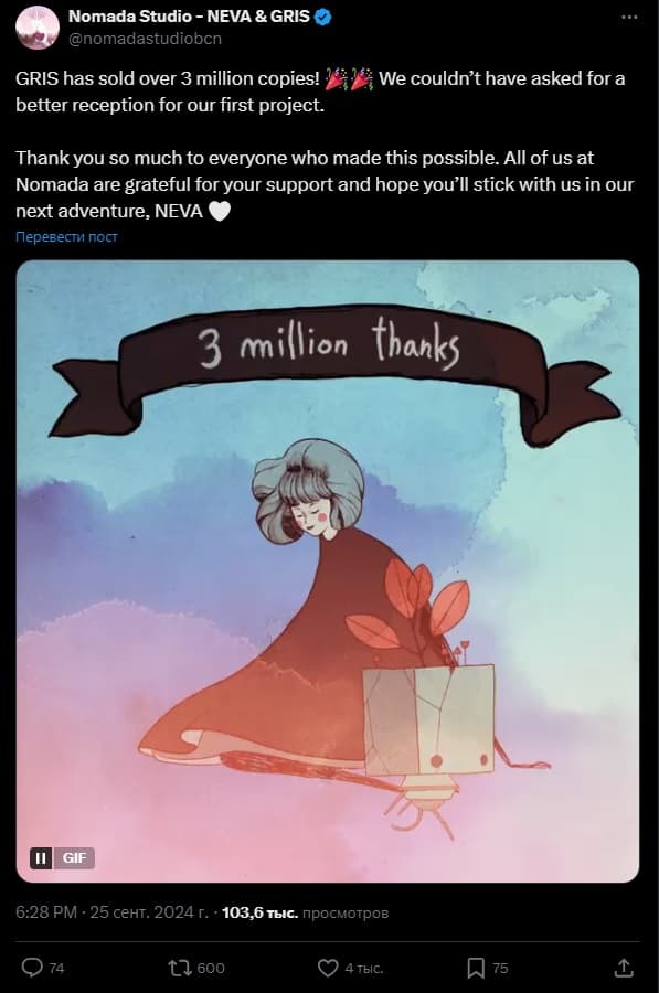 «GRIS продана тиражом более 3 миллионов копий! Мы не могли ожидать лучшего приема для нашего первого проекта. Огромное спасибо всем, кто сделал это возможным. Все мы в Nomad благодарны за вашу поддержку и надеемся, что вы будете с нами в нашем следующем приключении, Neva».