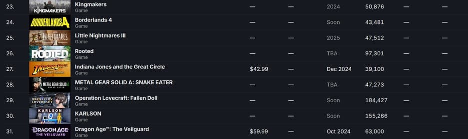 Как видно на изображении ниже, игра не вошла в список из 30 самых желаемых игр Steam. Многие другие проекты с гораздо меньшими тратами на маркетинг находятся выше в списке, что показывает низкий интерес многочисленных фанатов известной франшизы.