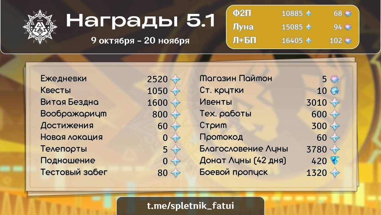 Сообщество Genshin Impact готовится фармить контент 5.1 и различные энтузиасты пытаются оценить потенциальные награды. В сообществе «Genshin Impact [RC]» обратили внимание на вычисления «Сплетник Фатуи» — результаты были оформлены в формате таблицы.