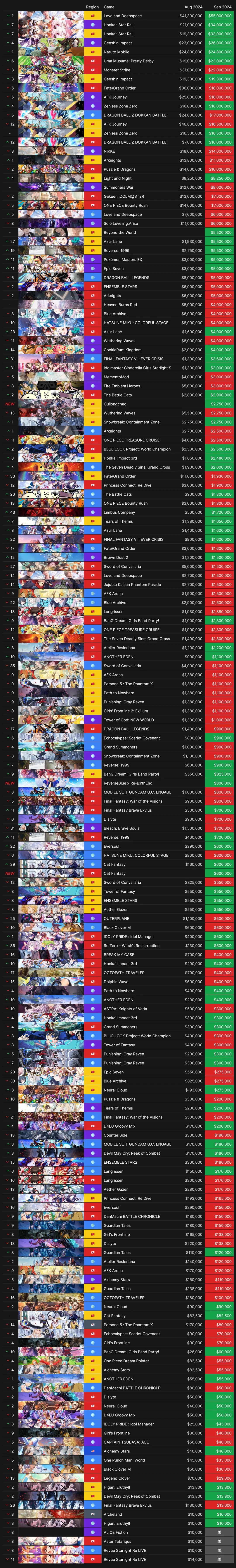 Ниже представлены данные по доходам гача-игр в сентябре 2024 года — есть разбивка по региональным версиям (Китай / Япония / Глобальная), а также топ, где доходы версий складываются. При составлении рейтинга учитываются только мобильные версии гача-игр, некоторые из них ещё представлены на ПК и консолях, т.е. реальные показатели дохода могут быть значительно выше в ряде случаев.