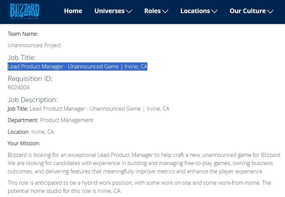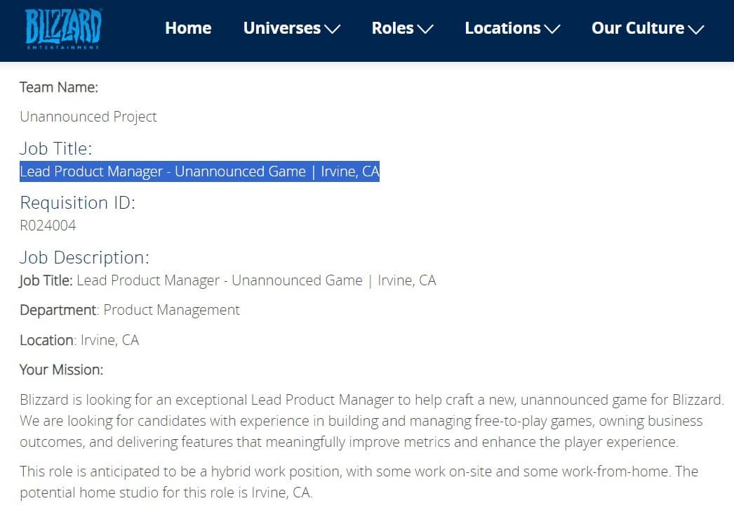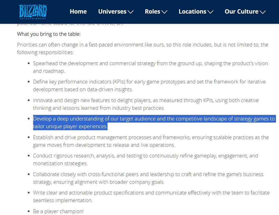 Далее говорится, что менеджер должен разбираться в стратегических играх, чтобы улучшать впечатления игроков. Есть намёк на игру по вселенной World of Warcraft или новый бренд, но похожий на последний..