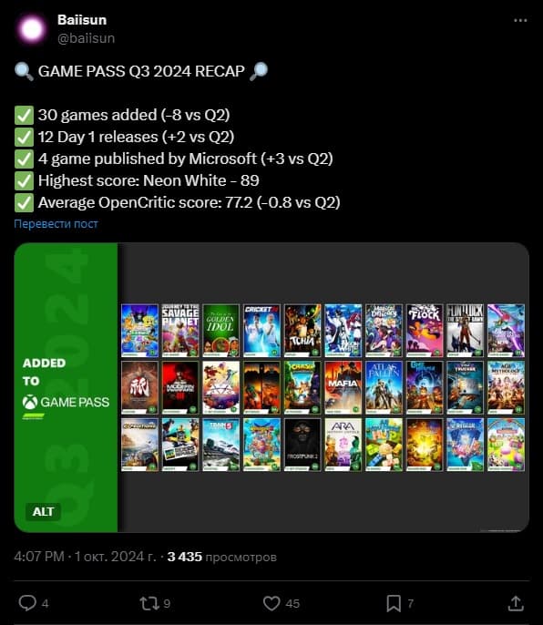 Хорошее резюме о состоянии Xbox Game Pass в последнее время дал пользователь сети X с ником Baiisun. В прошлом квартале, в период с июля по сентябрь, подписчики Game Pass получили доступ к 30 играм.