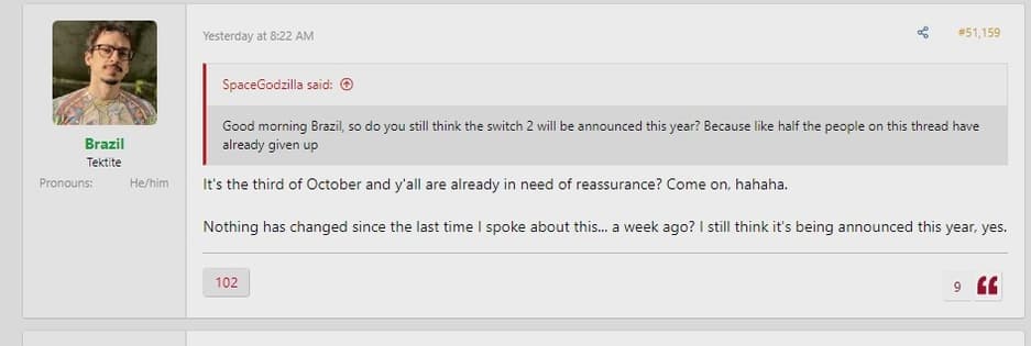 Один из информаторов форума Famiboards с ником «Brazil» утверждает, что анонс Nintendo Switch 2 состоится в конце 2024 года. Стоит отметить, что у этого пользователя есть опыт точных предсказаний относительно Nintendo Direct и запусков игр в 2024 году.