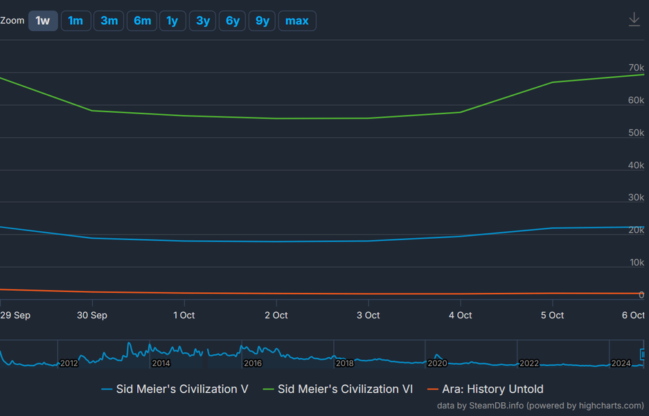 На графике синим и зелёным цветом обозначен онлайн Civilization 5 и 6 соответственно, а внизу Ara History Untold.