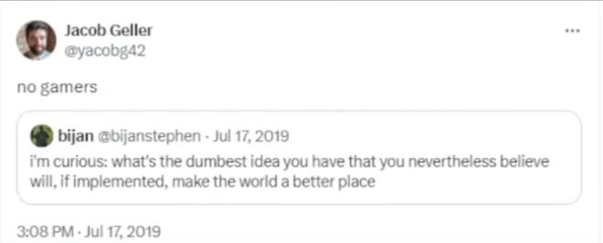 В социальной сети один пользователь задал вопрос: «Мне интересно: какая самая глупая идея у вас есть, но вы тем не менее верите, что её реализация сделает мир лучше» — на что Джейкоб Геллер ответил: «никаких геймеров».