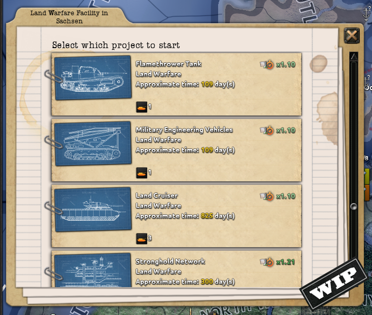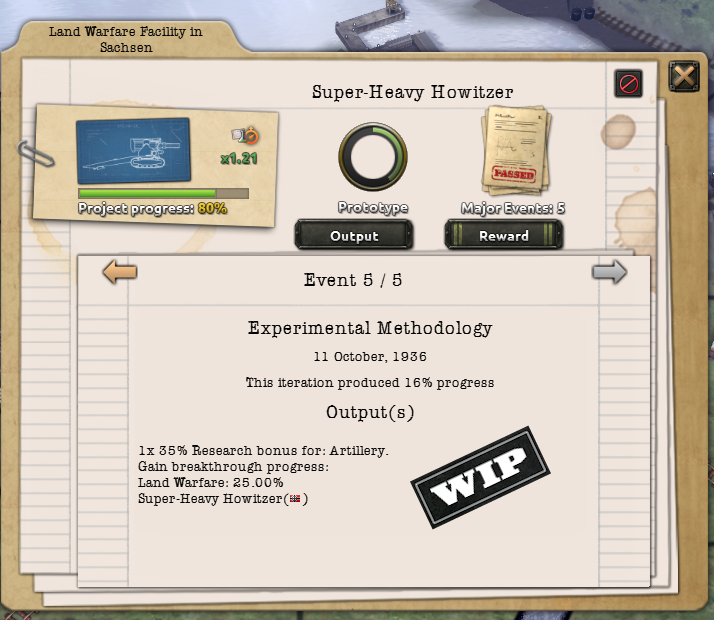 «...Особый проект ядерного реактора не только открывает возможность их строить, но и даёт один бесплатный в том же регионе, где находился экспериментальный объект (при условии, что для него есть место). Проект сверхтяжёлого железнодорожного орудия не только позволяет их производить, но и мгновенно создаёт одно такое по окончании разработок».