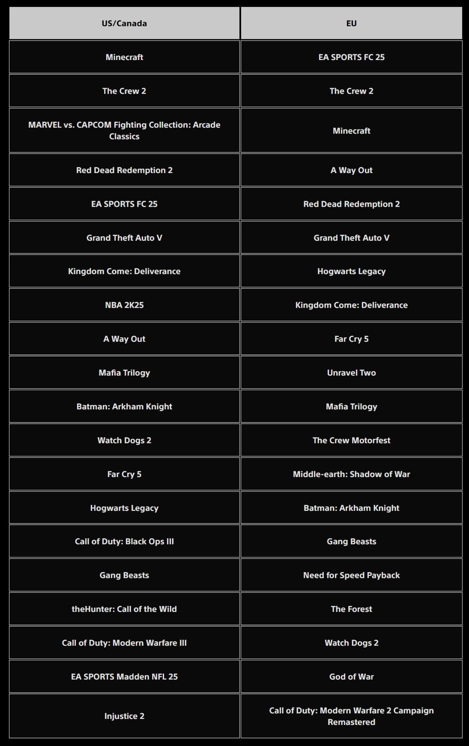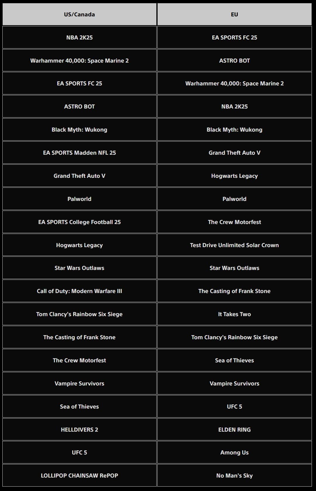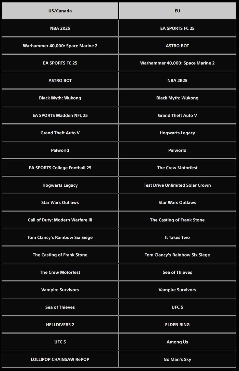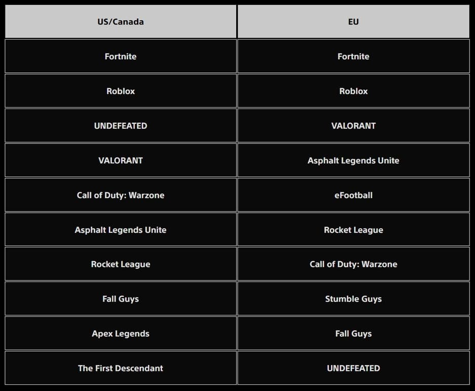 Компания подвела итоги предыдущего месяца и назвала самые скачиваемые игры в сентябре 2024 года. Ниже можно ознакомиться с разбивкой по США/Канаде и Европе.