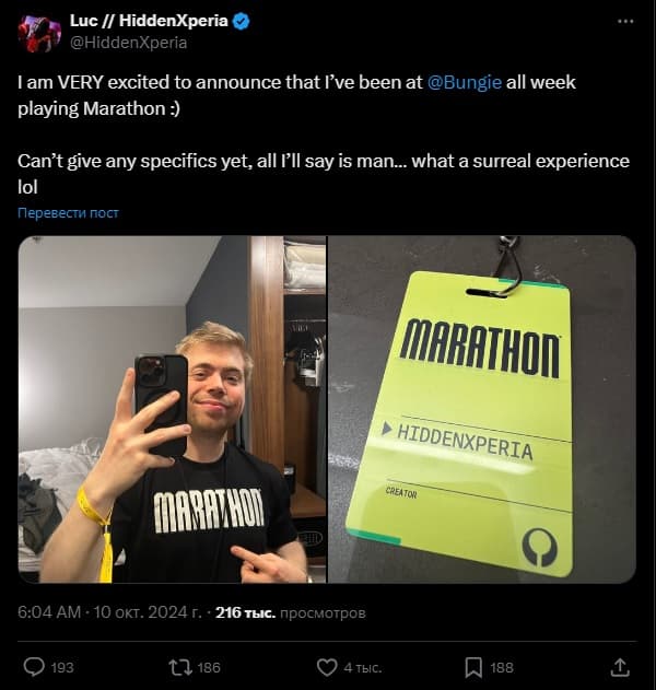 «Я очень рад сообщить, что целую неделю был в [штаб-квартире - ред.] @Bungie, играя в Marathon :)