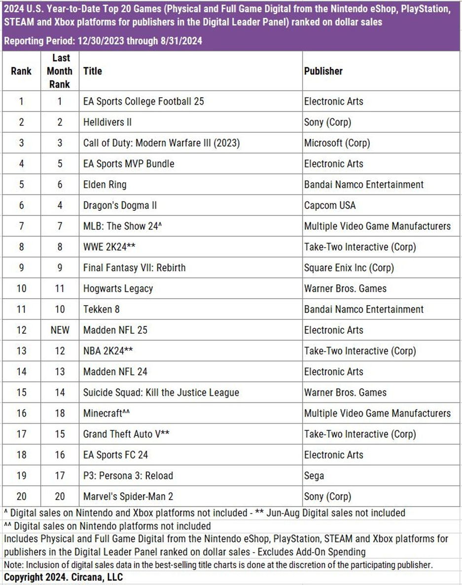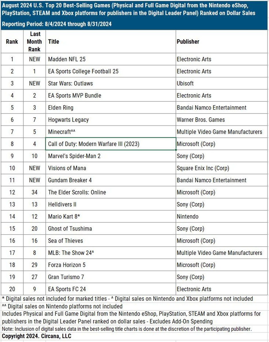 Топ-20 самых продаваемых игр США в августе 2024 года.