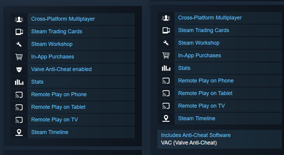 По какой-то причине Valve отказалась от выделения своего античита в виде тега «Valve Anti-Cheat enabled», теперь он приравнен к другим DRM-защитам — упоминание о его использовании размещается под остальными тегами.