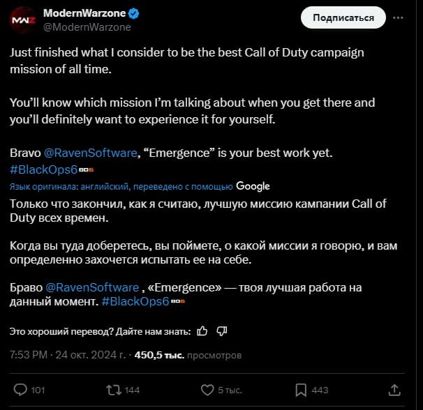 Пользователь ModernWarzone (907 тысяч читателей) на платформе X назвал «Emergence» лучшей миссией кампании в истории CoD. Аналогичные отзывы можно найти в других аккаунтах и на Reddit, где игроки призывают испытать эту уникальную последовательность самостоятельно.