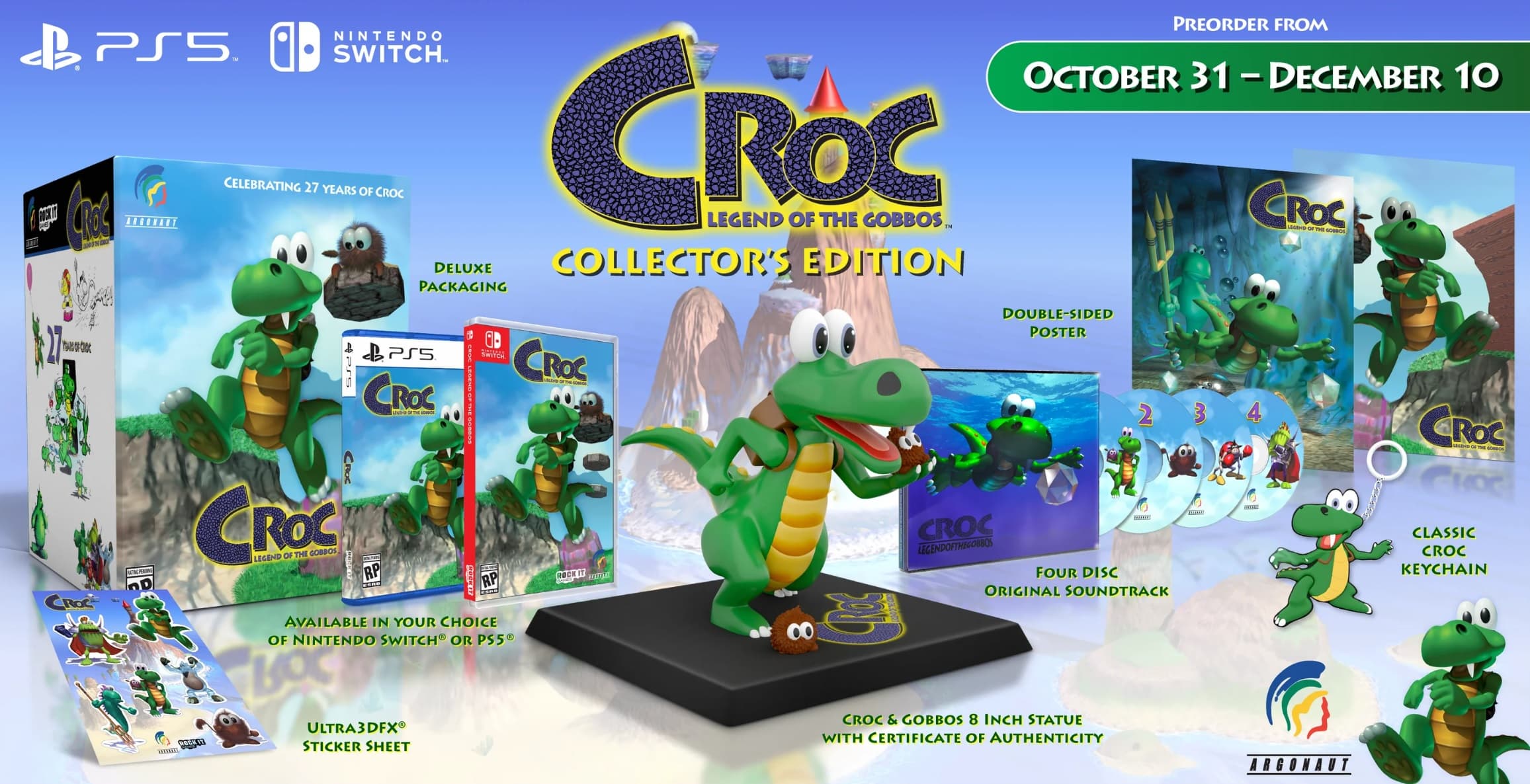 Оба издания будут доступны только на PlayStation 5 и Nintendo Switch. Цифровая версия Croc: Legend of the Gobbos появится на PS4/PS5, Xbox One, XSX|S, NS и ПК эксклюзивно в GOG.