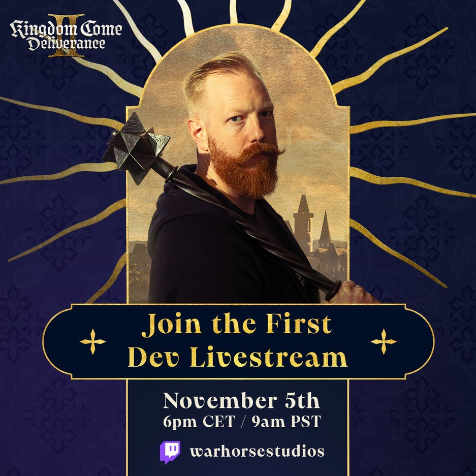 «Ожидание закончилось — наш первый стрим по Kingdom Come Deliverance 2, который ведёт не кто иной, как Sir Tobi [PR-менеджер студии Warhorse], состоится 5 ноября в 6pm CET / 9am PST [20:00 по московскому времени]