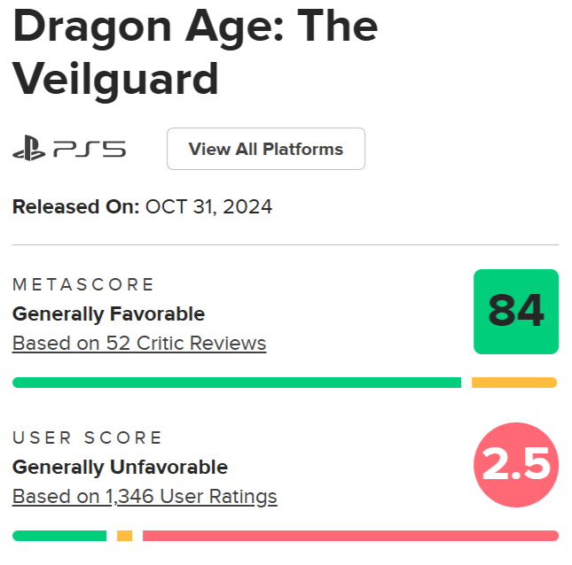 После 52 обзоров журналистов Dragon Age The Veilguard получила средний балл 84 из 100 (PS5).