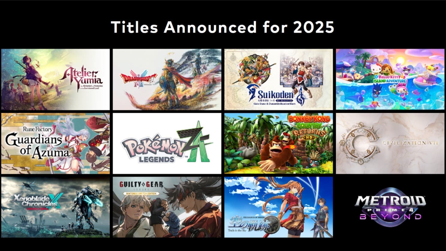 Nintendo поделилась изображением 12 игр для Switch, которые ожидаются в 2025 году, включая собственные игры, а также громкие проекты сторонних компаний, таких как Square Enix и Arc System Works.
