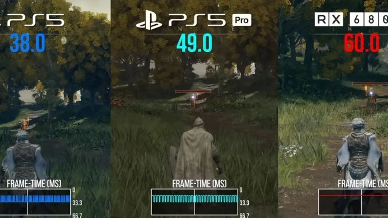 При запуске Elden Ring в режиме качества, эквивалентном настройкам 4K на ПК, PS5 Pro отстает от RX 6800. RX 6800 обеспечивает более стабильные 60 fps с более плавным временем смены кадров.