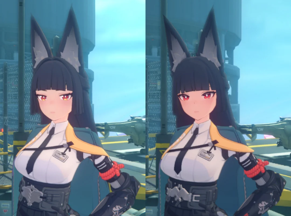 Разработчики услышали сообщество — miHoYo пересмотрела её внешность. В сети появилось сравнение модели девушки: у неё поменялось как лицо, так и некоторые элементы одежды. Теперь у пряжки с «двумя руками» пальцы сплетены не так сильно, как раньше; расположение и дизайн глаз изменились; лицо тоже скорректировали.