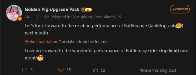 В своем блоге на Weibo инсайдер написал: «С нетерпением жду восхитительной производительности Battlemage (на настольных компьютерах) в следующем месяце».