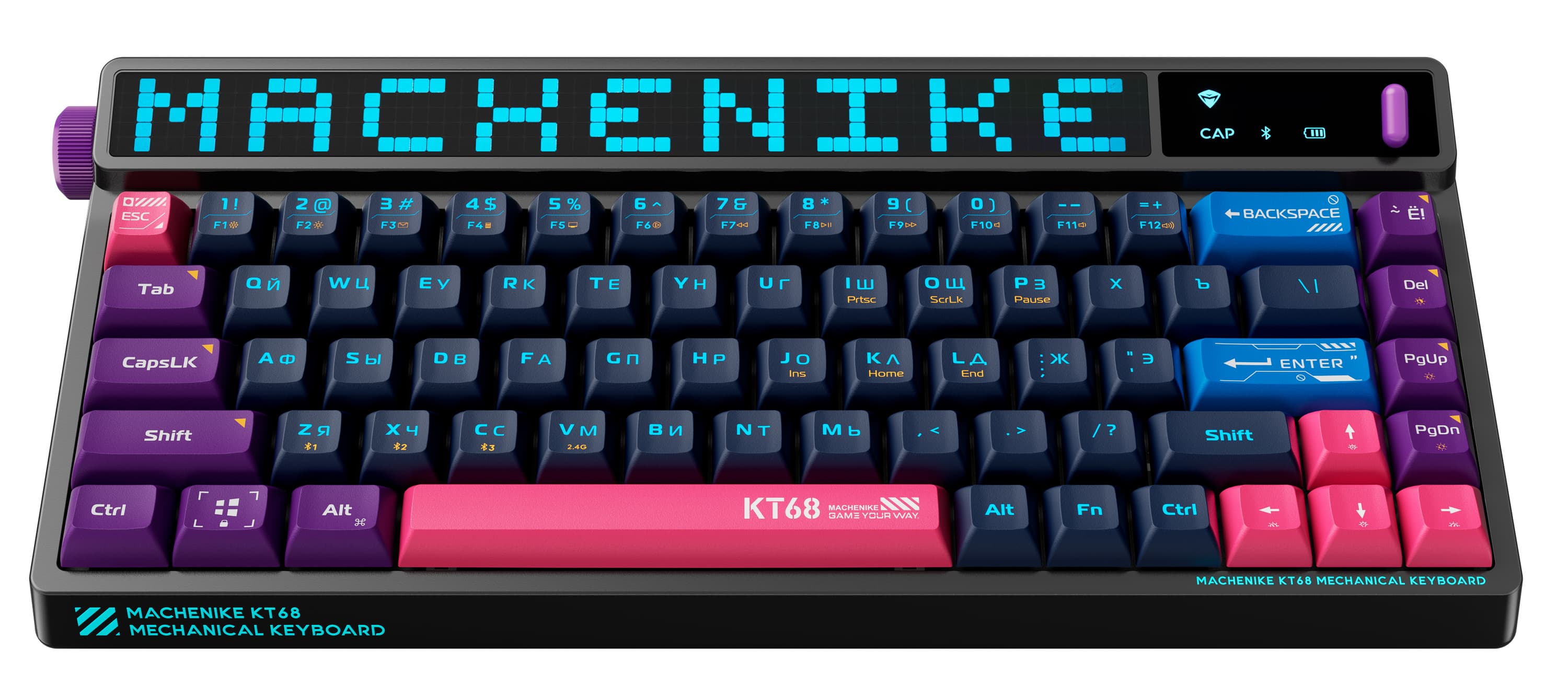 KT68 Smart Screen — это механическая клавиатура с LED-экраном из 325 пикселей, позволяющим настроить отображение по своему вкусу. В 68 клавишах используются переключатели Gateron Yellow Pro 3.0 (как заявлено, смазанные на заводе и обладающие встроенной рассеивающей линзой для увеличения яркости подсветки) и PBT-кейкапы. Ход до срабатывания — 2 мм, общий ход — 4 мм. Усилие нажатия — 50 г, а нажатия до упора — 67 г. Устройство поддерживает проводное подключение, а также Bluetooth и по проиетарном радиоканалу. Автономность в беспроводном режиме обеспечивает аккумулятор ёмкостью 4000 мАч. Клавиатура весит 962 грамма. В России клавиатуру оценили в 14 тысяч рублей.