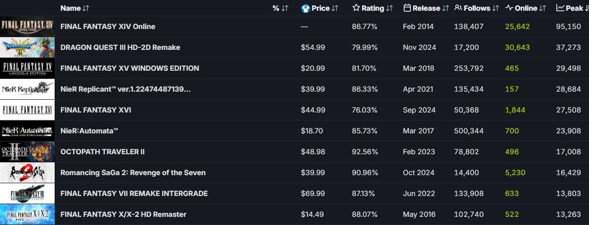 Лучшим показателем Square Enix в Steam остаётся Final Fantasy 14 с более чем 95 000 одновременных игроков, что кажется недосягаемым для Dragon Quest 3 HD-2D.