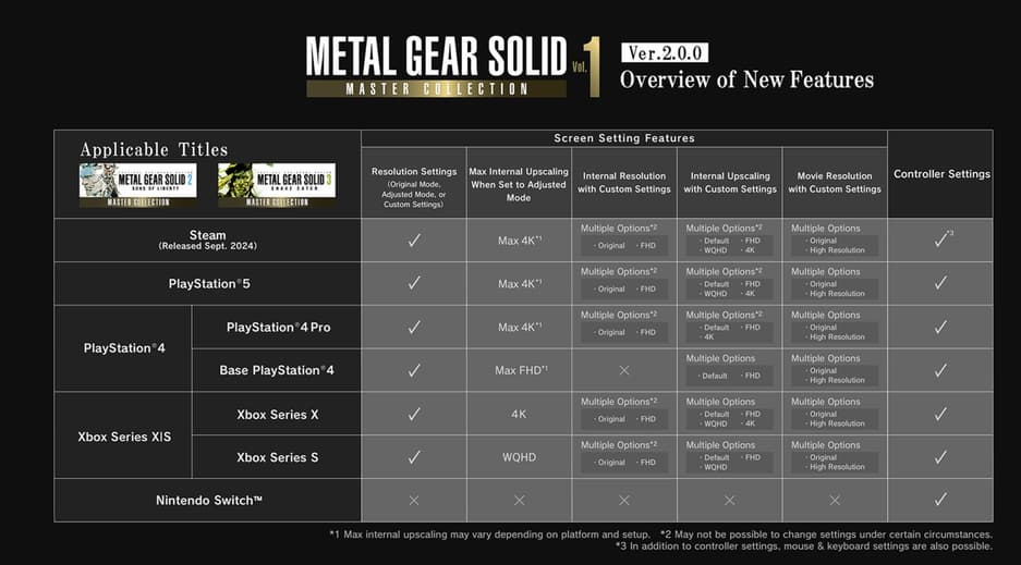 В конце сентября обновление 2.00 выпустили на ПК. Разработчикам потребовалось почти два месяца, чтобы выпустить этот же патч для консолей. Обновление добавляет новые опции в настройках графики, позволяющие масштабировать изображение до более высоких значений. Графика станет немного четче, но чудес ждать не стоит. Кроме того, эти функции доступны только в Sons of Liberty и Snake Eater.