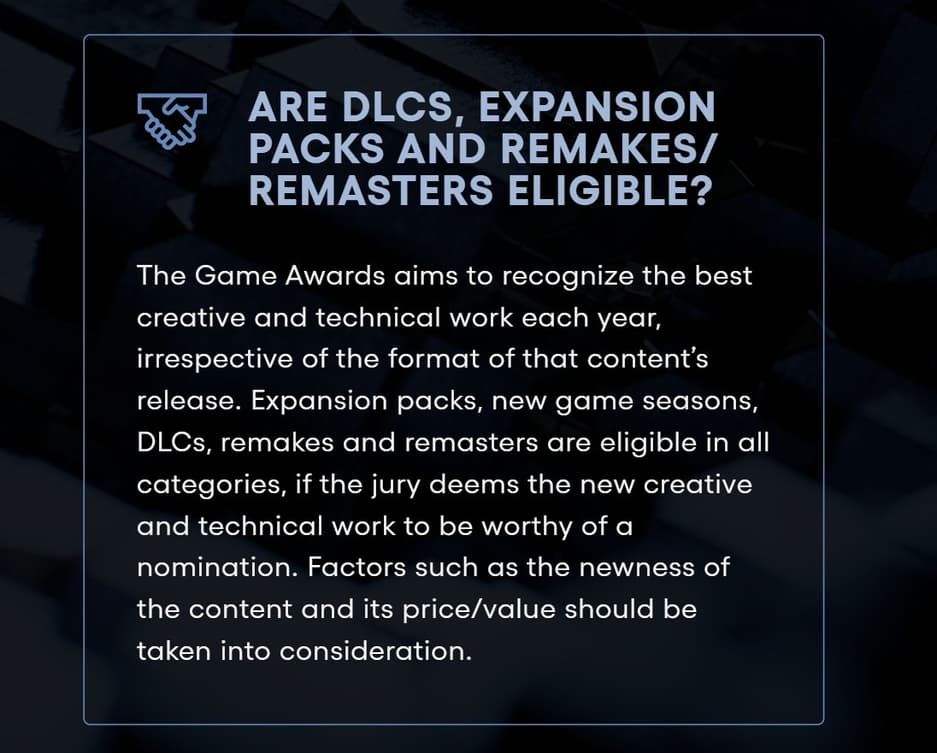 Дополнения, новые игровые сезоны, ремейки и ремастеры могут быть представлены во всех категориях, если жюри сочтет новую творческую и техническую работу достойной номинации.