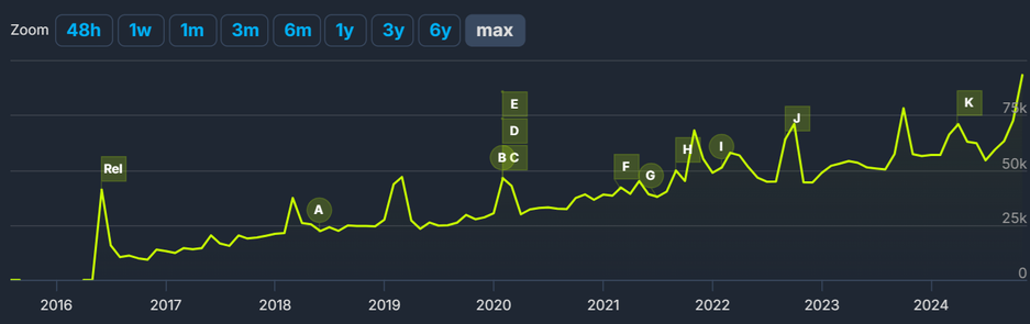 График онлайна Hearts of Iron 4 в Steam (2016 - 2024):