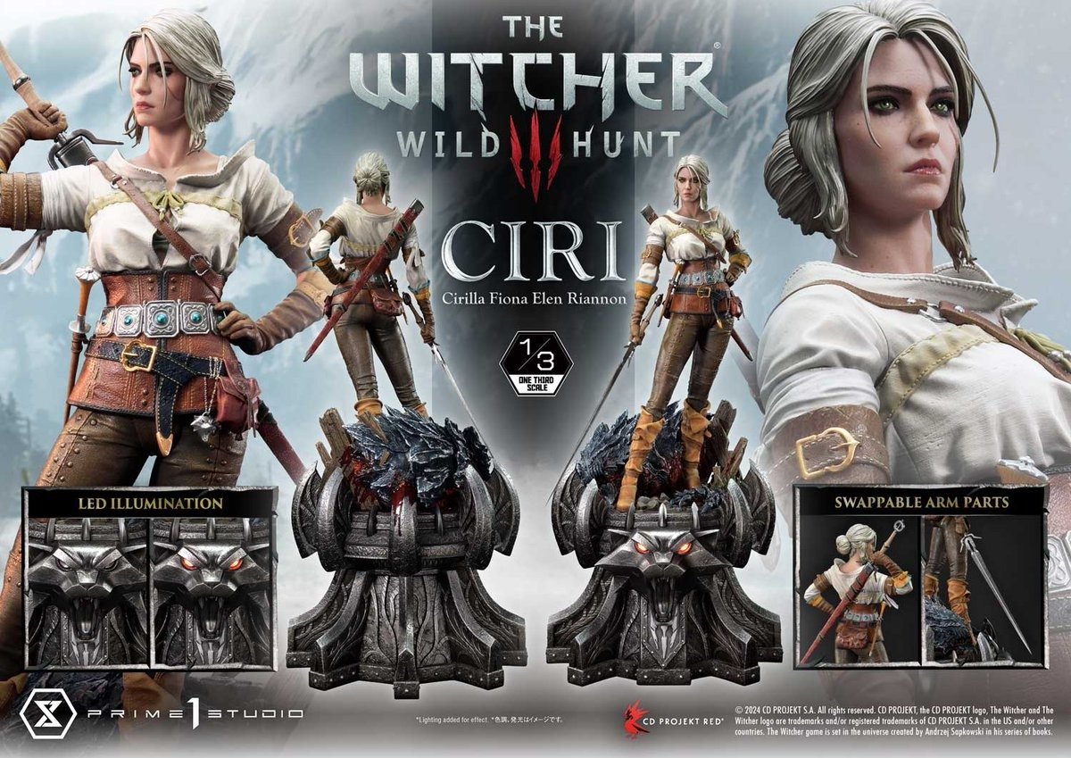 Фигурка будет большой: высота воплощения Цири — 81 см, а вес примерно 19,5 кг. В комплекте сменные детали (рука с мечом; рука на мече за спиной), медальон школы Волка и подставка с LED-подсветкой.