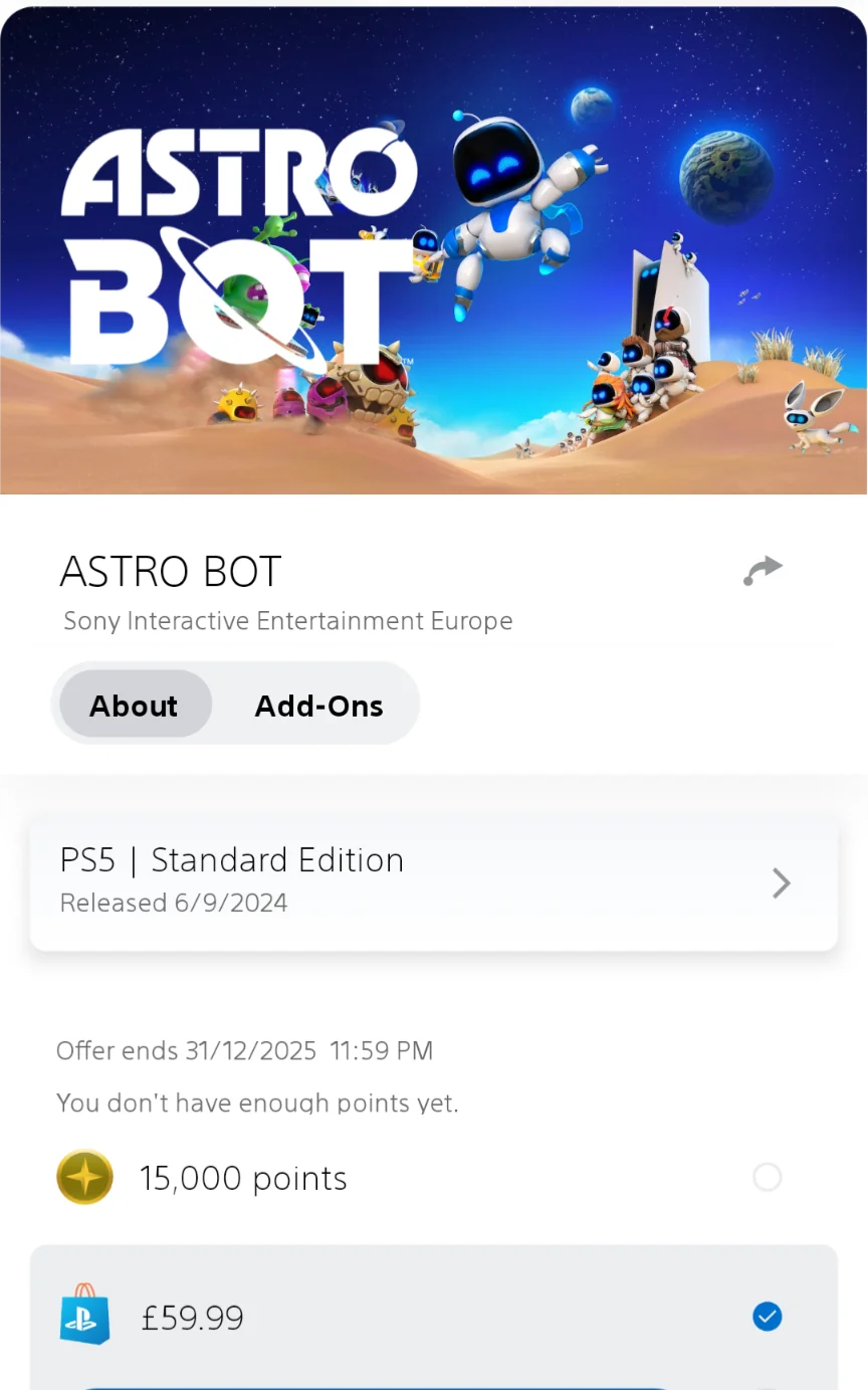 Дело в том, что Astro Bot предлагают приобрести за 15 тысяч баллов — safalum объяснил, что для получения такой суммы в PlayStation Stars геймеру придётся потратить 1500 фунтов стерлингов (порядка 189 тысяч рублей).
