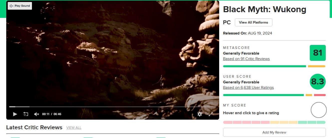 Игровые журналисты обратили внимание, что Black Myth: Wukong стала первым номинантом на «Игру года» с самым низким рейтингом на Metacritic за последние 10 лет.