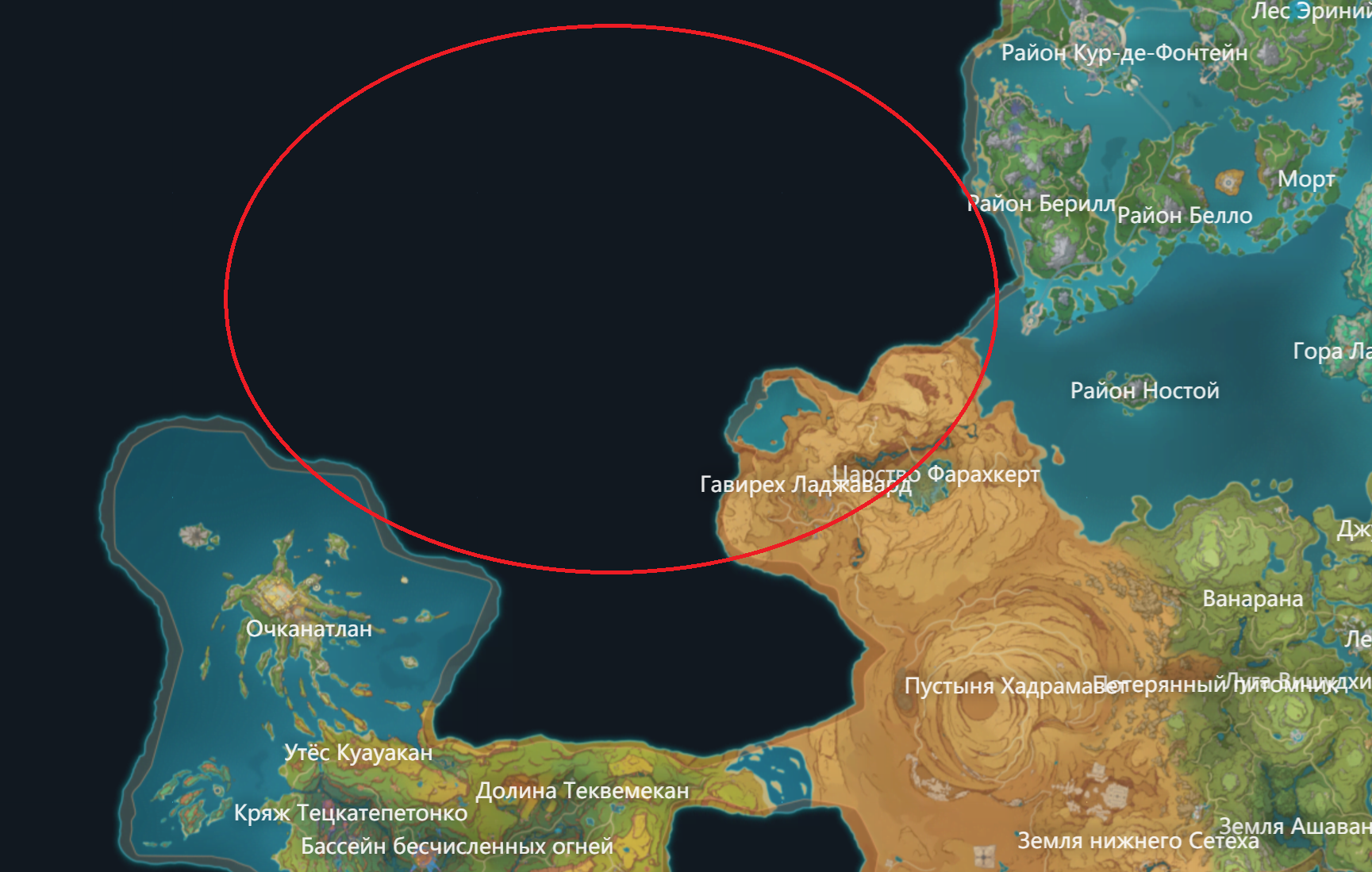 Актуальная карта Тейвата с отметкой примерной области расположения нового региона «Снежная». Предположительно, будет возможность попасть в неё через Сумеру или Фонтейн.